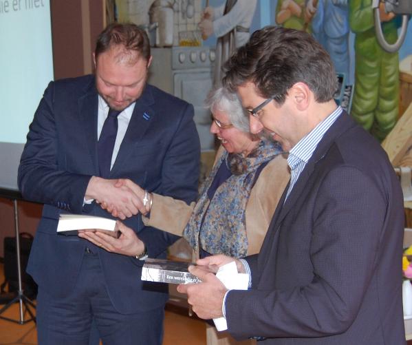 - Harm Benthem (L) met Corry van Straten (M) en Stephan Valk (R) met de eerste exemplaren van het boek.
